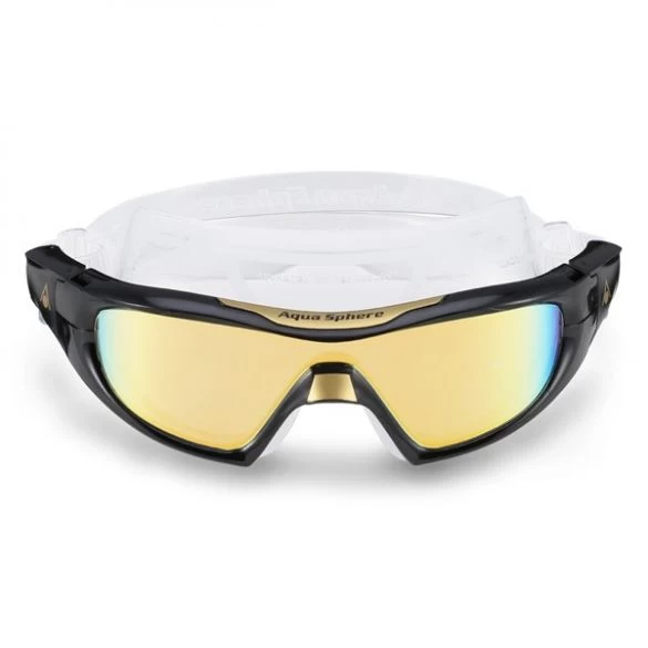 De Aqua Sphere Vista Pro multilayer mirror lens zwembril zwart biedt een 180 graden panoramisch gezichtsveld dankzij de gebogen enkele lens.
