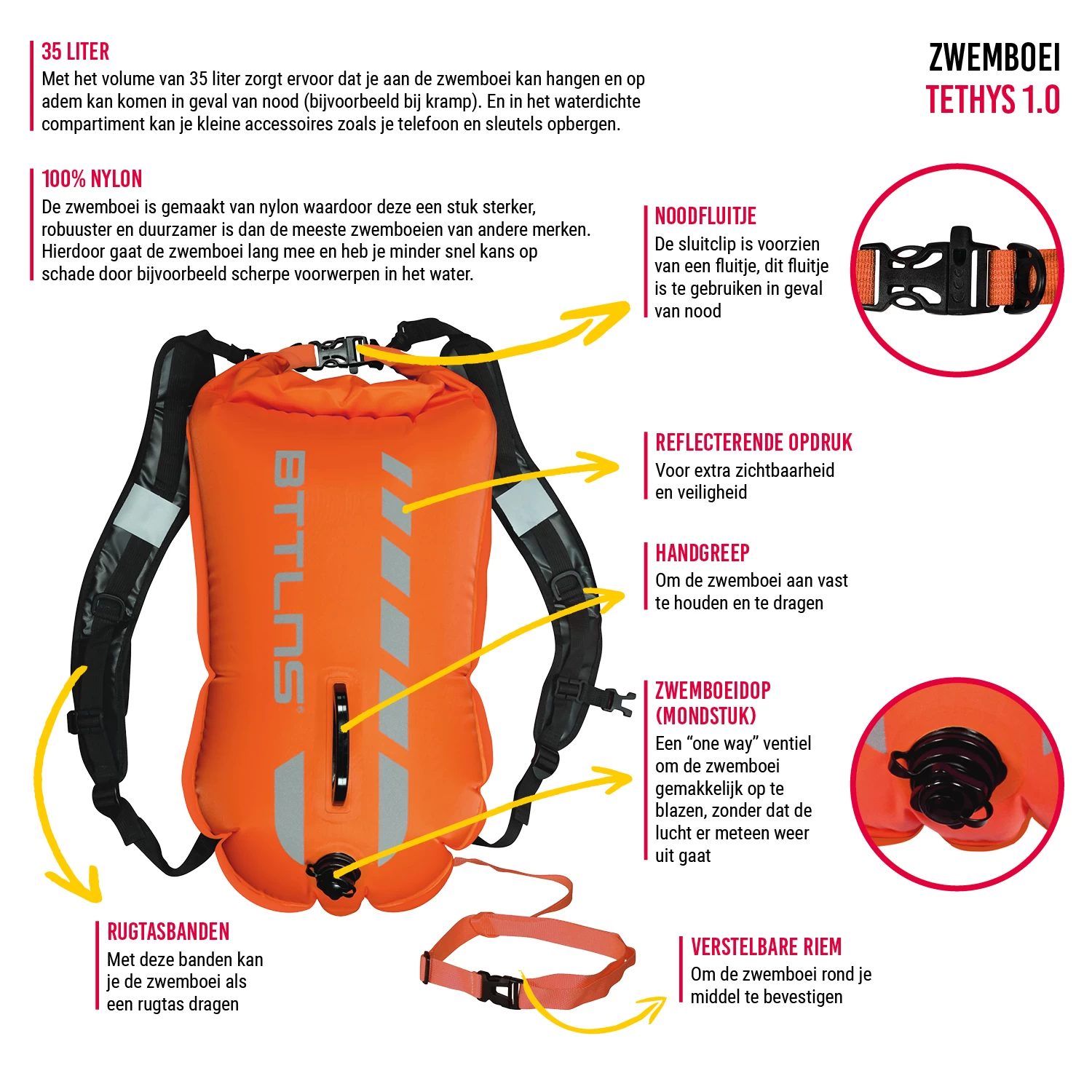 – De zwemboei is als rugzak te gebruiken en deze straps kunt u los maken