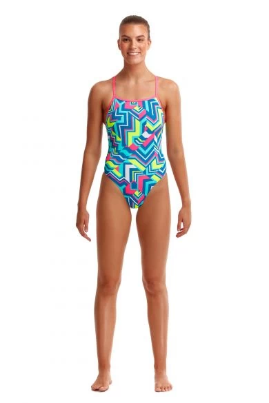 De Funkita Cut Lines tie me tight biedt een eendelige stijl die kriskras over uw rug loopt biedt u de flexibiliteit om het te knopen zoals